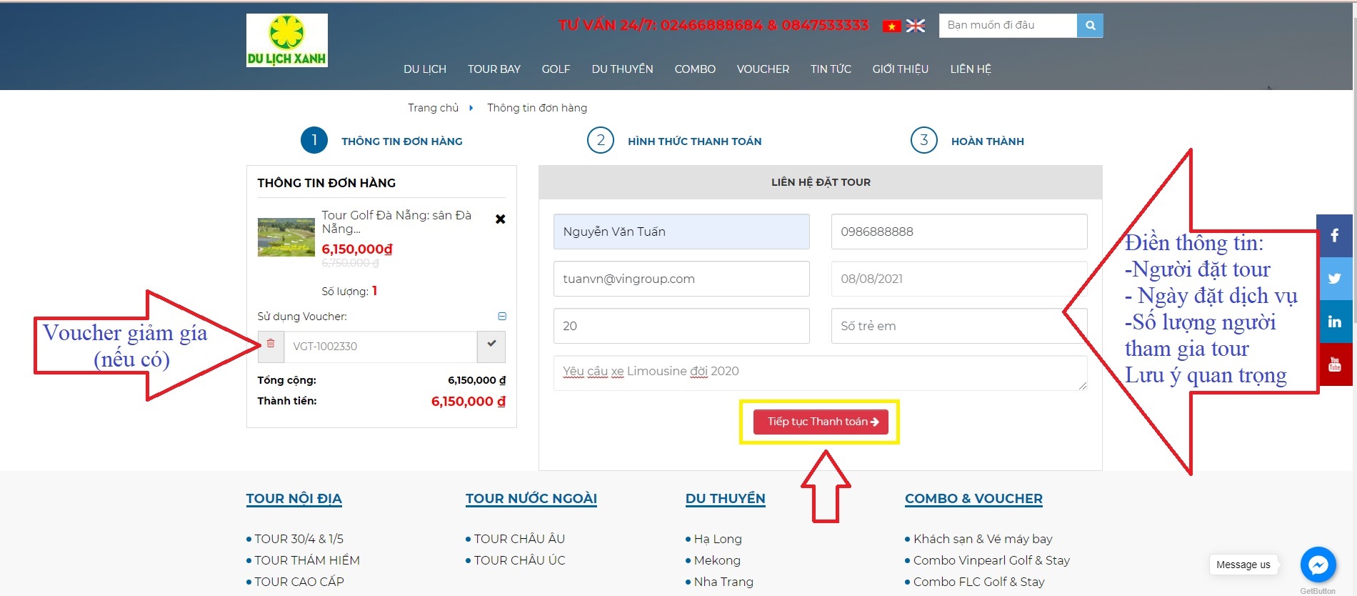 - Cung cấp email, Điền voucher giảm giá (nếu có) được cung cấp từ Du Lịch Xanh