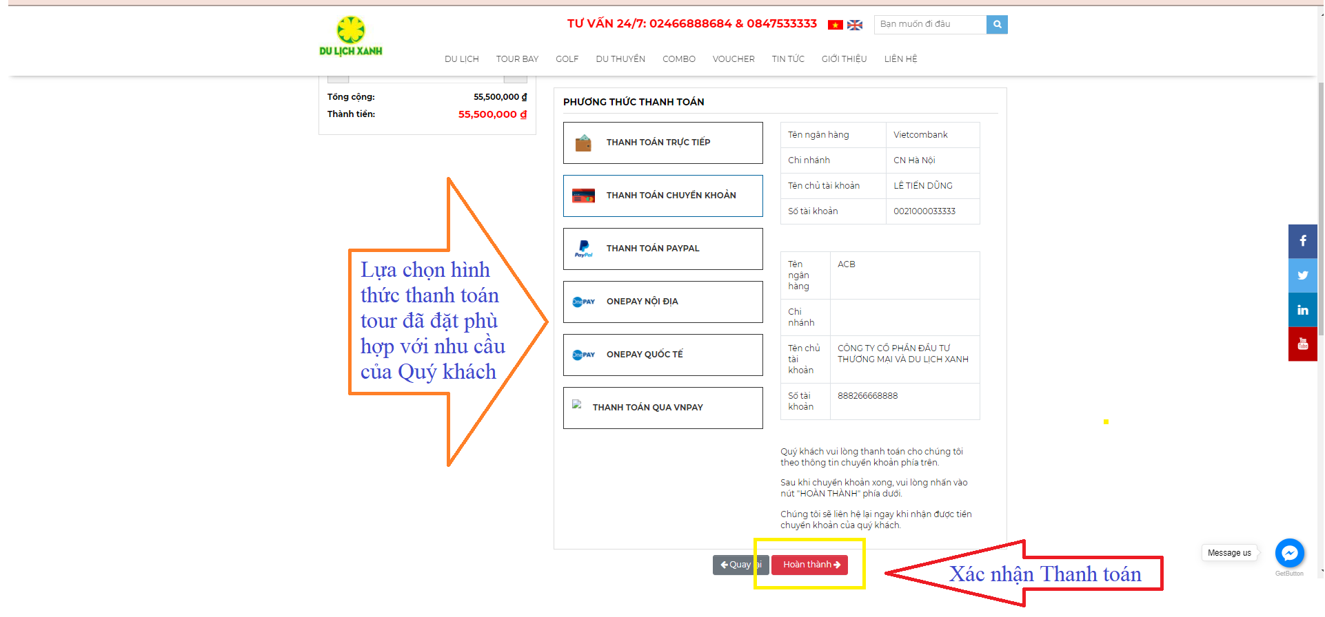 2. Thanh toán bằng chuyển khoản qua ngân hàng Công Ty Du Lịch Xanh - Viet Green Travel