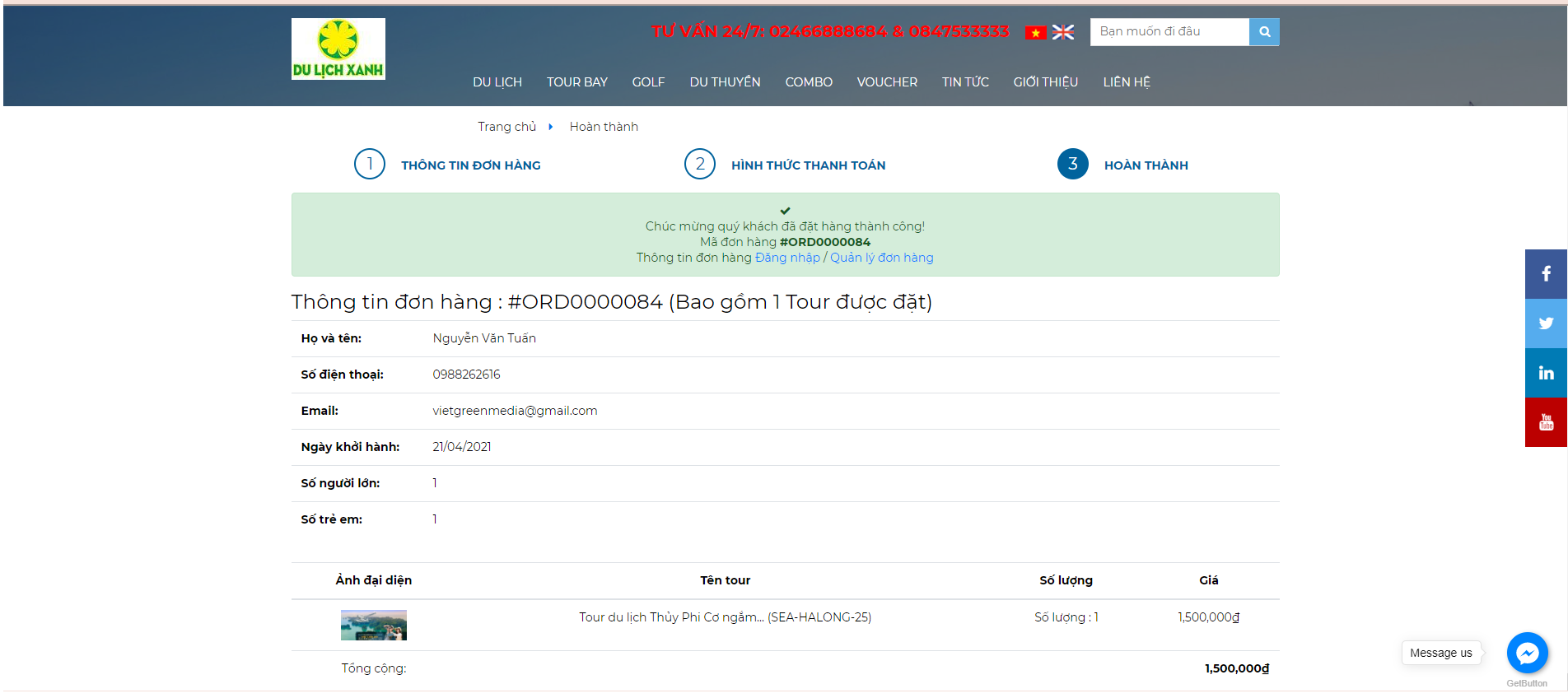 Hệ thống Du Lịch Xanh sẽ tự động gửi email xác nhận dịch vụ hoặc bộ phận chăm sóc khách hàng của Du Lịch Xanh sẽ liên hệ Quý khách để xác nhận và hoàn tất đơn hàng.