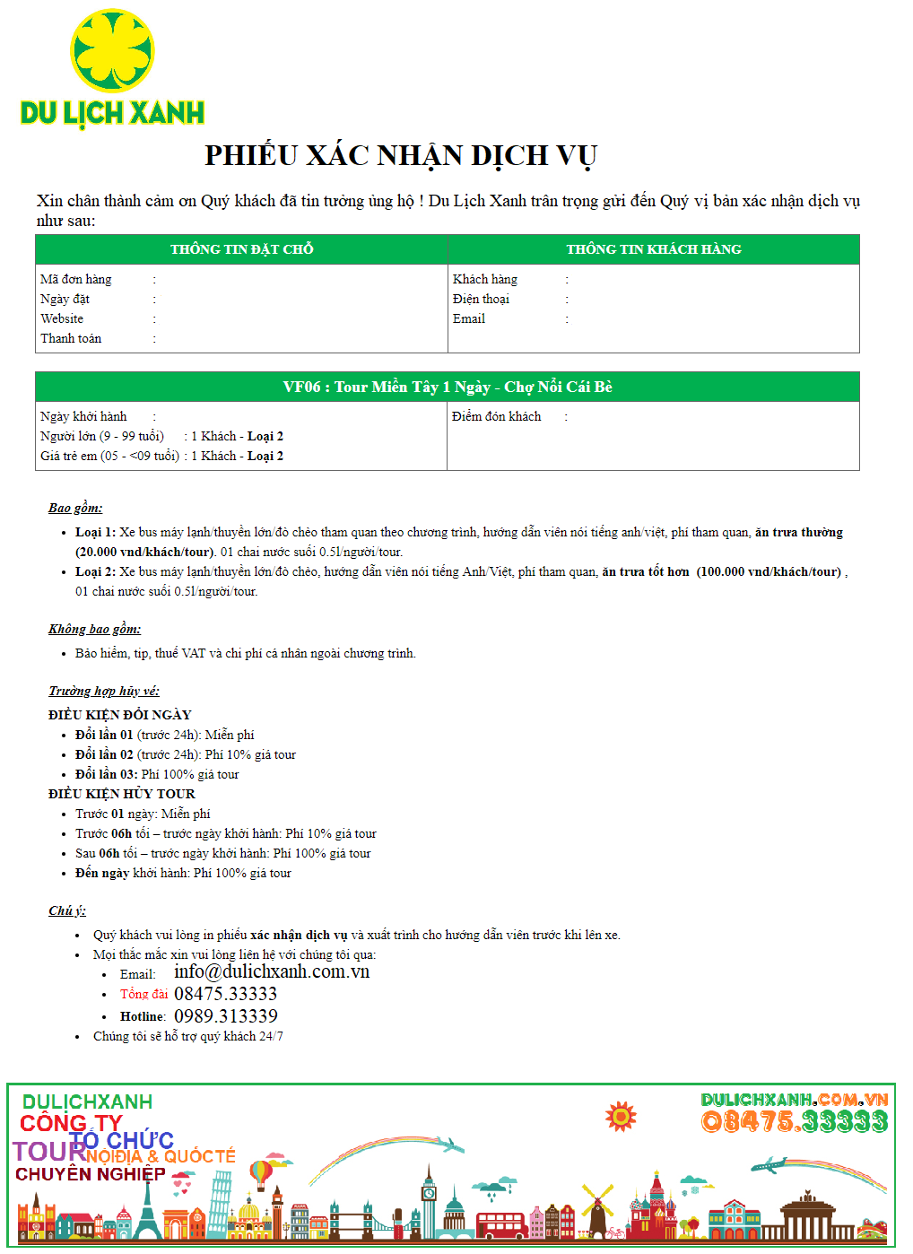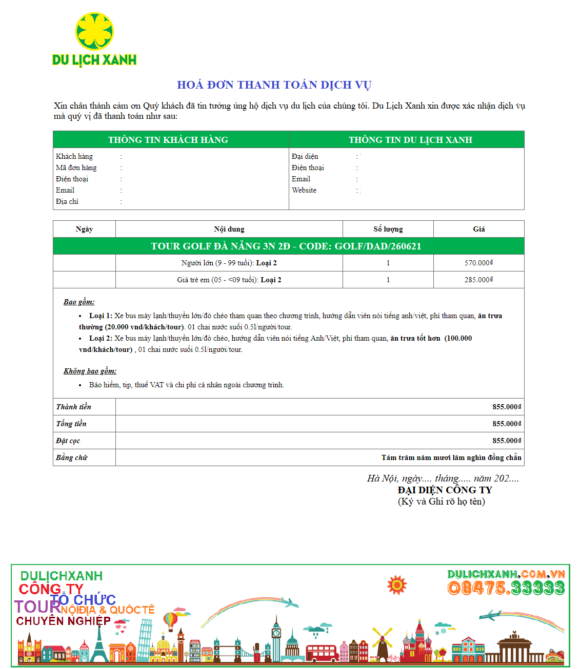 4. Sau khi Quý khách thanh toán thành công, chúng tôi sẽ gửi phiếu xác nhận và hóa đơn thanh toán tại văn phòng Du Lịch Xanh nếu Quý khách thanh toán trực tiếp hoặc qua email/fax nếu Quý khách chuyển khoản.